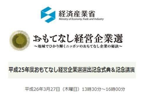 経済産業省「おもてなし経営企業選」 平成25年度の選出企業発表とトロフィー受賞式が 来週27日(木)13:30~16:00 行なわれます。 ご自由に参加いただけます。 お申込み受付中♪ →http://omotenashi-keiei.go.jp/ 今年の選出企業は何社? どんな企業? 当日…