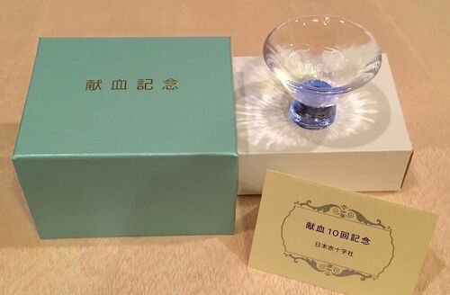 久しぶりに献血に行ってきました。 すると、今日が10回目だったそうで記念品をいただきました。 なんだか、かたじけないけれど、 綺麗なおちょこで、正直、うれしいです。 あれ?お酒って血にいいんだっけ…、 などと野暮なことを考えるのはやめて、 あとで乾…