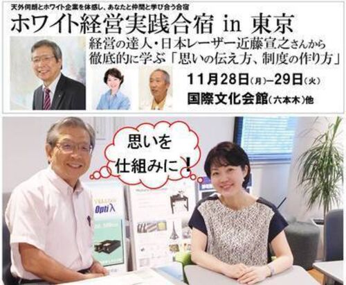 【2016年11月28~29日 ホワイト経営合宿】 ~日本レーザー 近藤宣之社長が徹底レクチャー~ 日本レーザーHPより(社長からのメッセージ) http://info.japanlaser.co.jp/message ・“社長第一主義”と“社員第一主義”の両立とは? ・理念の浸透に欠かせないこと…