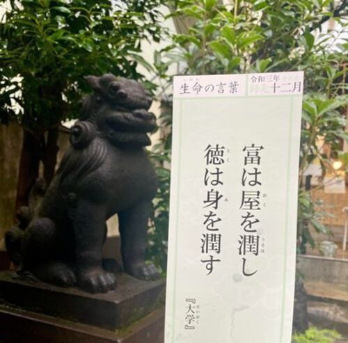 こんにちは。 今月は1日から出張だったので おついたち詣りの言葉をまだ書いていませんでした。 お詣りはしたのですが、 そのまま高知へ行ってしまったき。 今月の言葉は、 「富は屋(おく)を潤し 徳は身を潤す」『大学』 豊かな財産はその家を立派にするが…