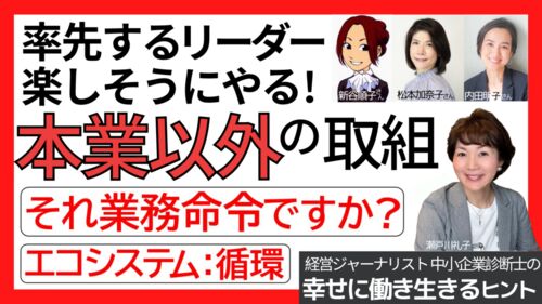 こんにちは。経営ジャーナリスト・中小企業診断士の瀬戸川礼子です。 YouTube【幸せに働き生きるヒント164】は[本業以外の取り組みでコミュニケーションを活性化するために] がテーマです。 日常業務だけでは、組織や役割を横断したやりとりが取れず、コミュ…