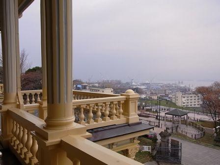 「旧函館区公会堂」のベランダから望む函館の街と港。