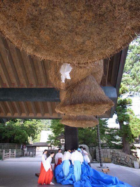 神楽殿があって、巨大な“しめ縄”の先をゆすって、