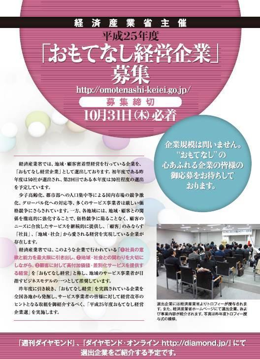 応募期間は平成25年9月12日(木)~10月31日(木)(必着)。 http://omotenashi-keiei.go.jp/kigyousen/information.html